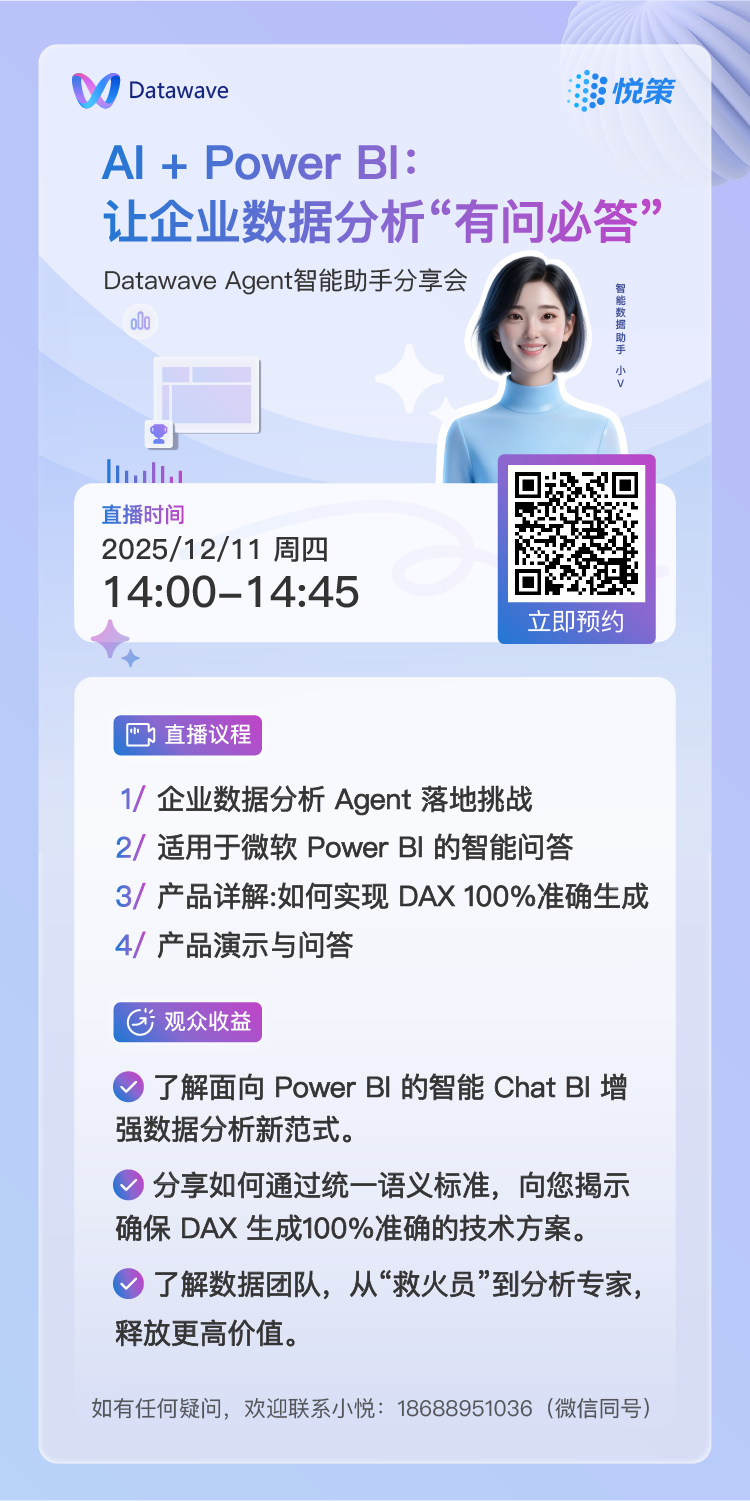 智能助手小V —— Power BI 分析 Agent(Datawave)和大家见面啦!懂数据、懂业务、会思考、会推荐、会解读…让数据分析更简单,小白也能轻松与数据对话~